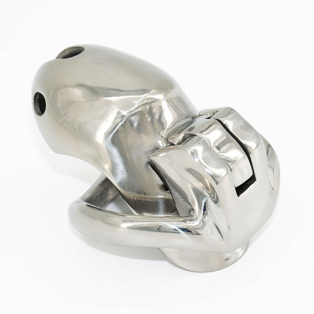 Keeping your caged long-term is good for you, and this device is just right for the job. Made from stainless steel, it assures a secure enclosure. The finish is ultra-smooth for long-term wear. Designed for the serious player, this rigid metal cage offers no chance for fun or gratification. Its ring is curved for comfort, and it seamlessly integrates with the body. A brass stealth lock seals it.